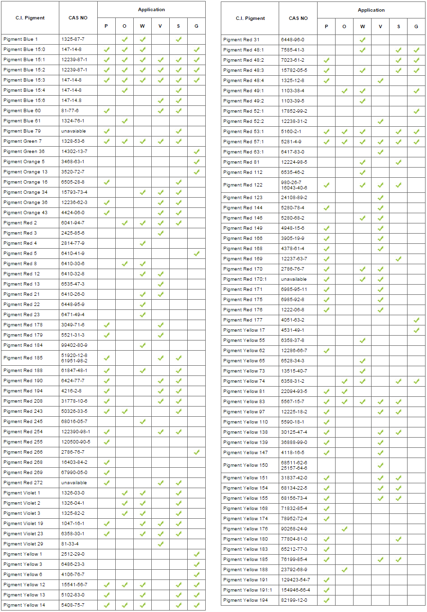 Note: P (Plastic), O (Offset ink), W (Water based ink), V (Paint), S (Solvent based ink), G (General type)
